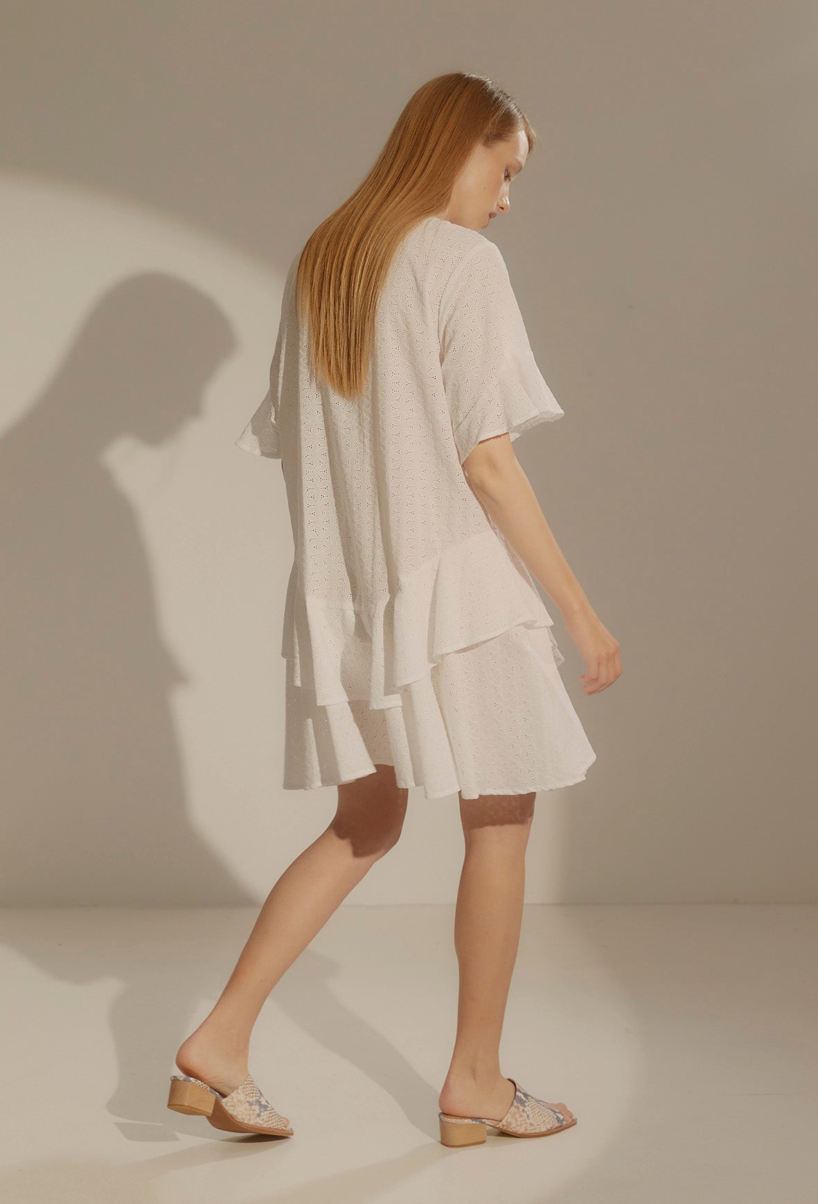 Floaty cotton dress featuring soft flare panels on body and sleeves, made in a cotton