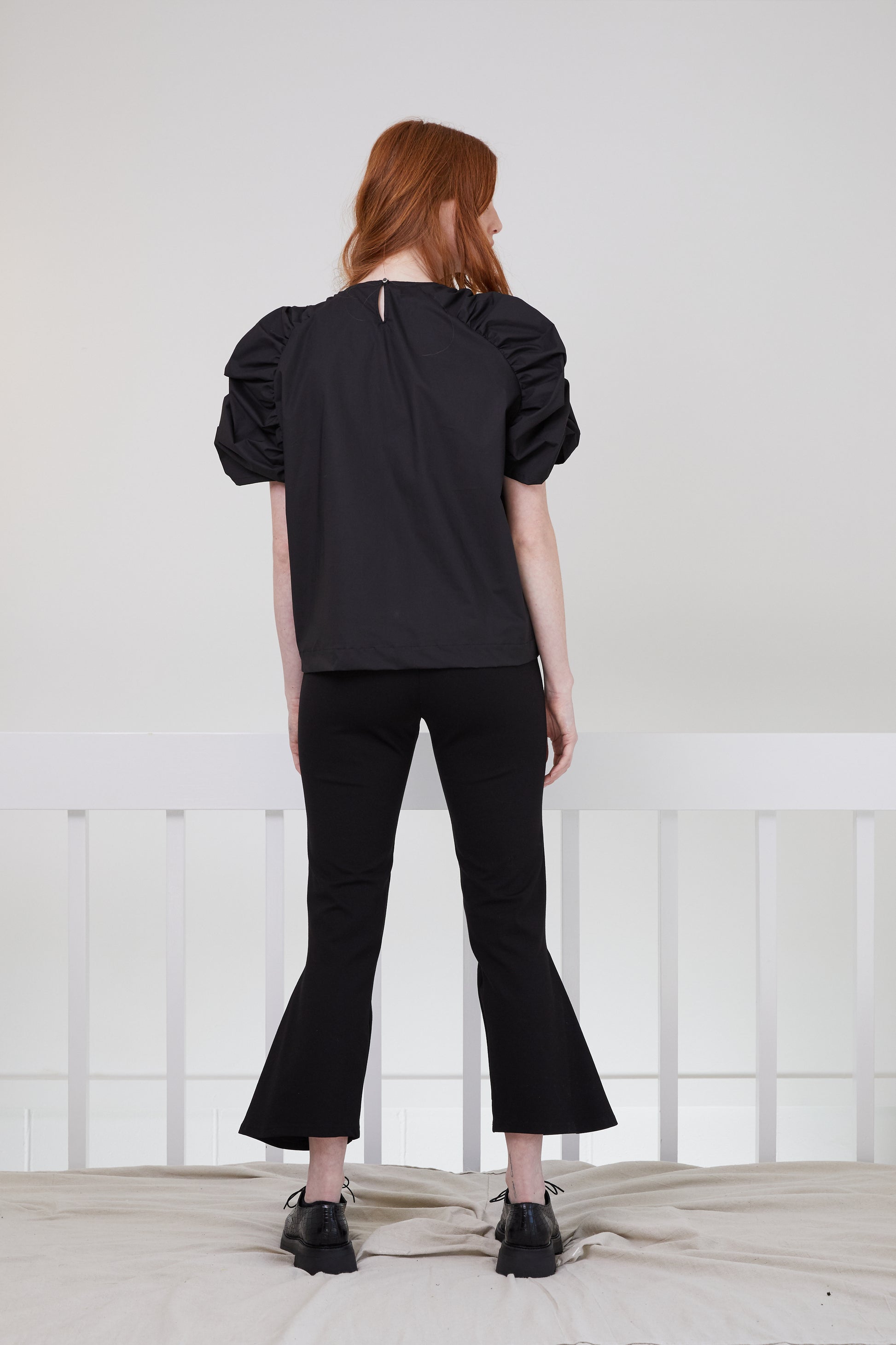 Relaxed fit woven tee featuring raglan sleeves and gathering, amplifying a puffy silhouette. Made in cotton this tee is easy and comfortable to wear, with the feature sleeves adding some fun and fancy.