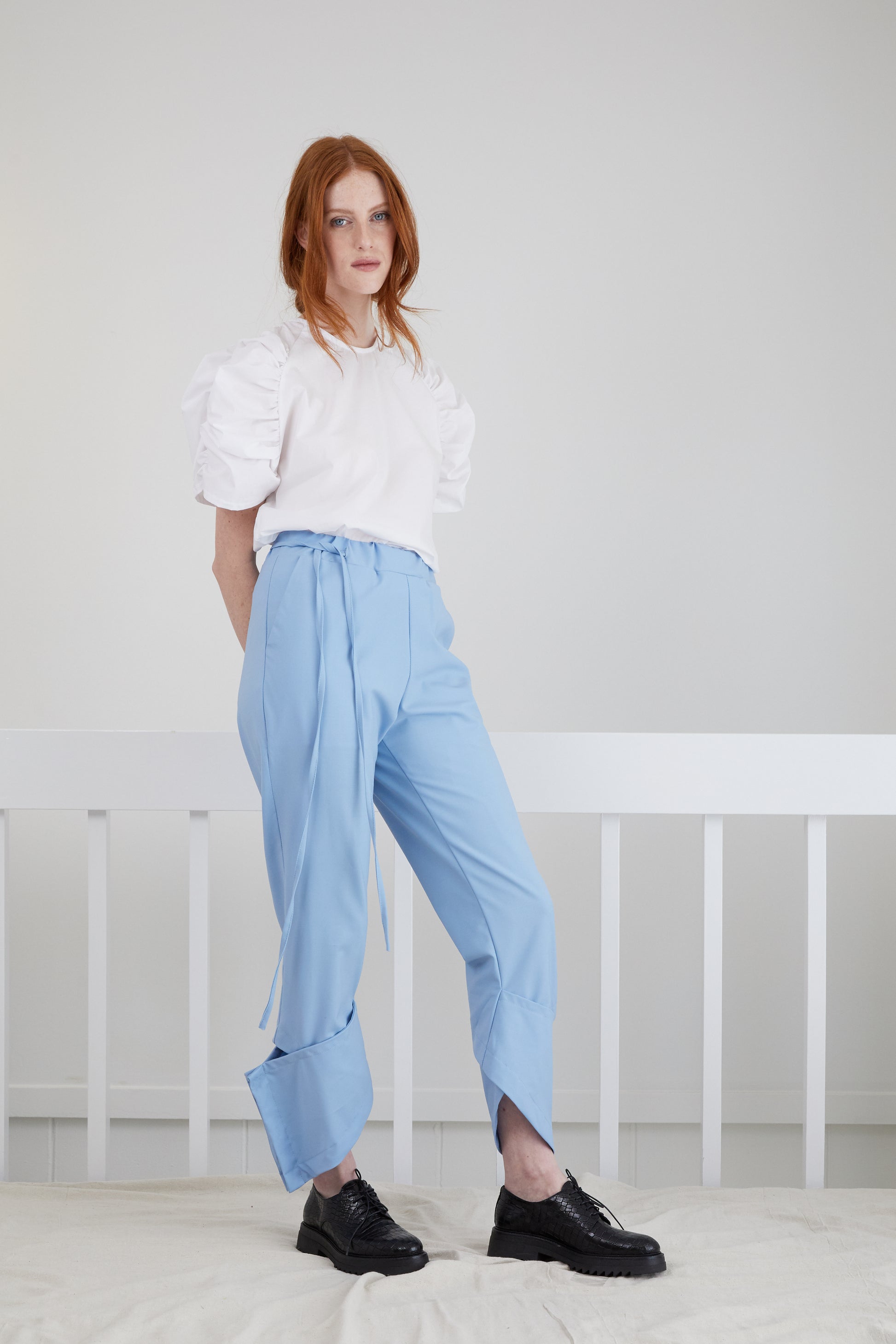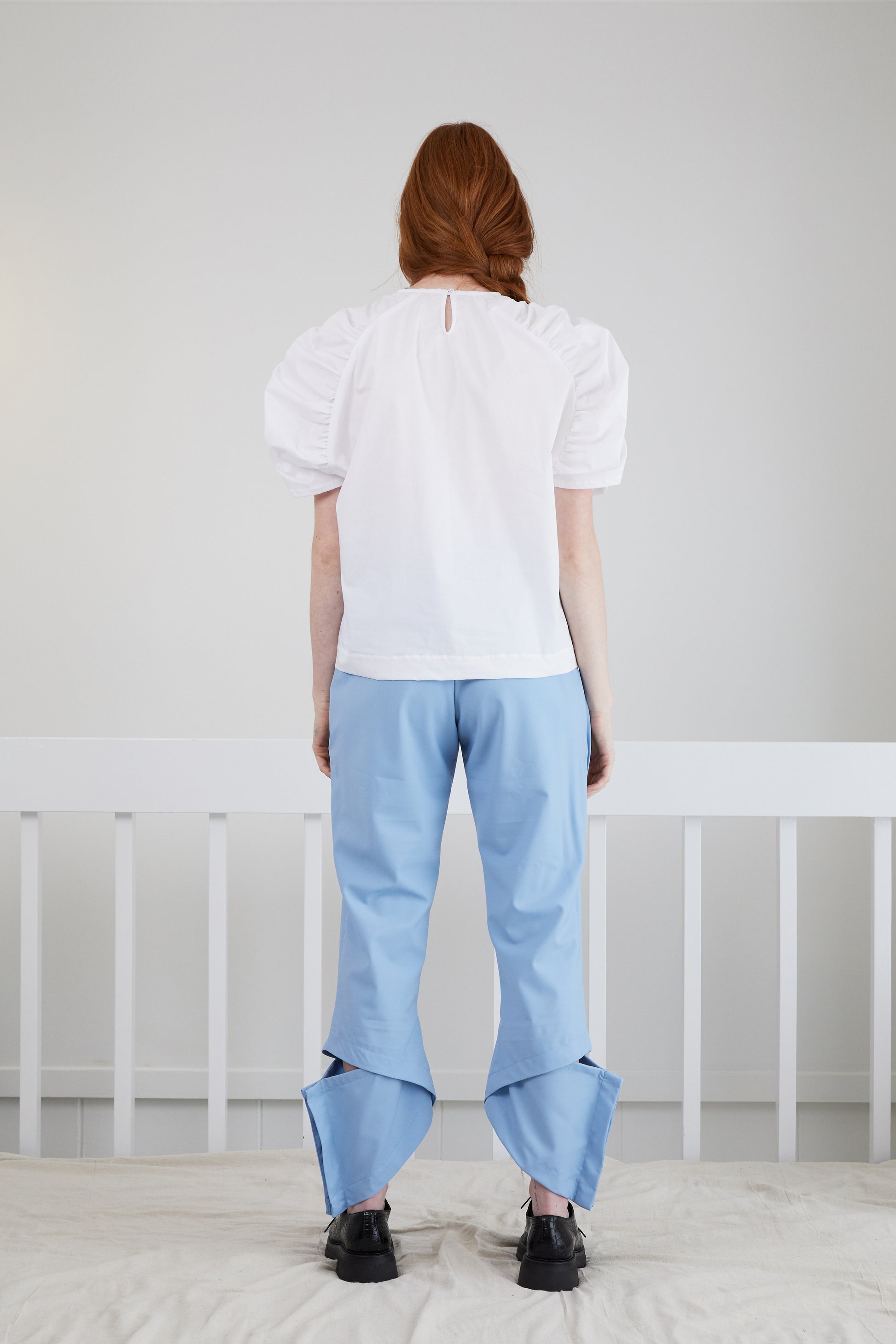Relaxed fit woven tee featuring raglan sleeves and gathering, amplifying a puffy silhouette. Made in cotton this tee is easy and comfortable to wear, with the feature sleeves adding some fun and fancy.